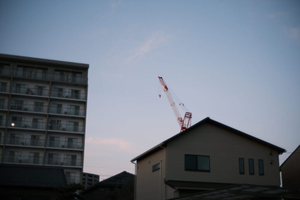 駅の方を見ると、大きいクレーンが。だいたいいつも工事しているなー、という印象。